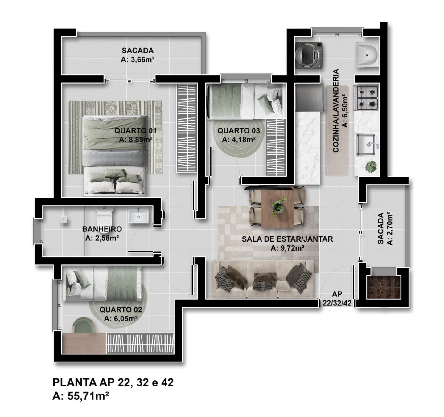 O apartamento está situado no 2° andar (3° pavimento), nos fundos do prédio, com face norte, ou seja, o apartamento recebe bastante luz solar. Possui 55,71 m² e tem a seguinte composição: